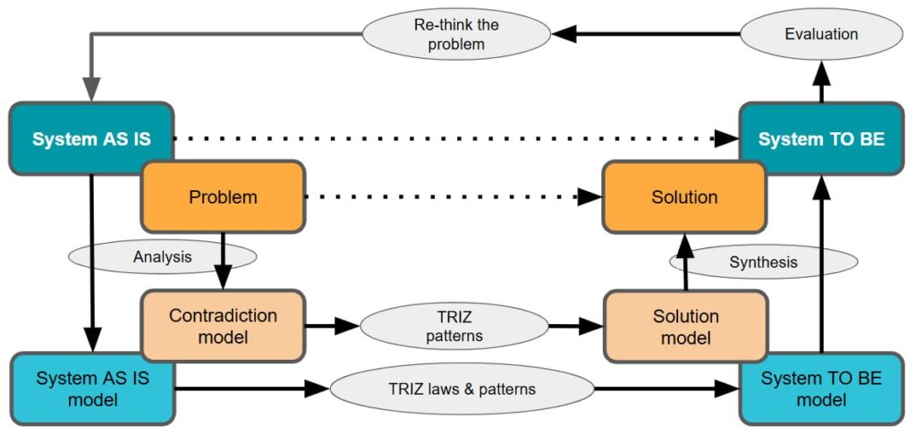 - Трансформация системы через выявление в исходной системе проблемы, синтез решения, и имплементация решения в целевую систему. Здесь используются инструменты ТРИЗ для решения проблем.